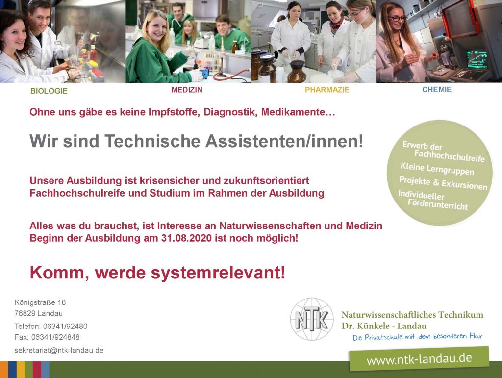 Bei Fragen erreichst du uns unter sekretariat@ntk-landau.de oder telefonisch unter 06341-92480, ebenfalls kannst du dich unter www.ntk-landau.de genauer informieren.